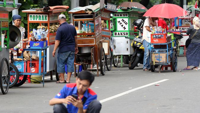 Pedagang kaki lima menjajakan makanan dan minuman di sisi jalan sekitar kawasan Patung Kuda Jakarta, Rabu (5/1/2019). Mereka mencoba peruntungan saat para buruh melakukan aksi perayaan Hari Buruh International atau May Day. (Liputan6.com/Helmi Fithriansyah)