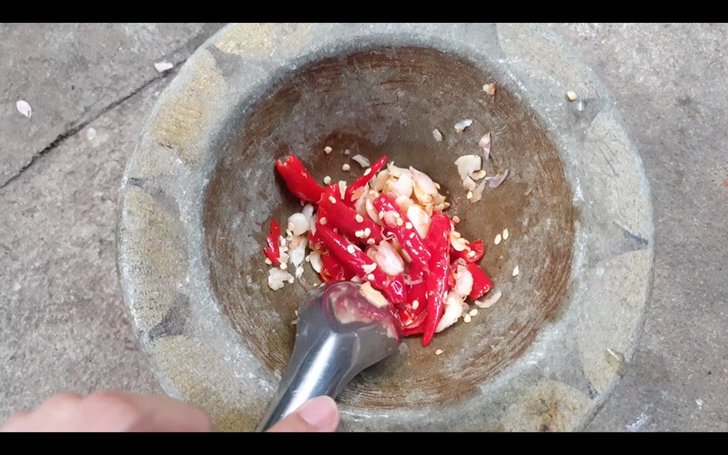 2. ถ้าอยากให้เผ็ดเพิ่มพริกขี้หนูลงไป แล้วตำให้แหลก ยิ่งแหลกยิ่งเผ็ด