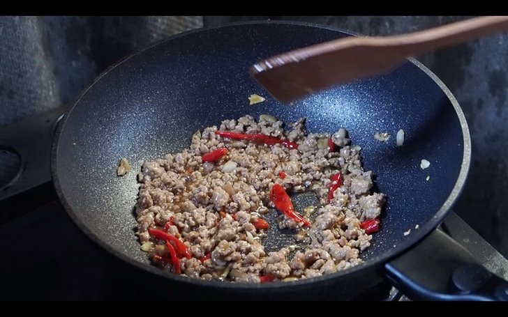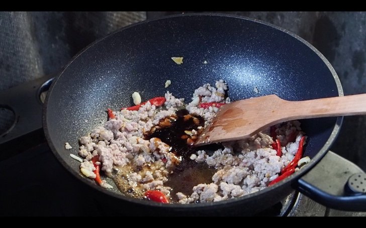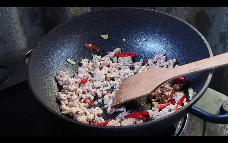 2. ตั้งกระทะใช้ไฟเกือบแรง ใส่น้ำมัน พอเริ่มร้อนใส่กระเทียมพริกที่โขลกลงไป ผัดจนหอม แต่ไม่ให้สีกระเทียมเข้มมาก ใส่หมูสับผัดและยีหมูที่ติดกันออกเป็นชิ้นเล็กๆ แล้วใส่น้ำเปล่าตาม