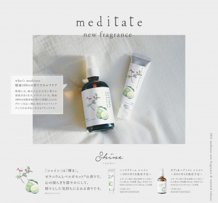 そんなmeditateに、この度ゼラニウムとベルガモットが香る新香調「Shine(シャイン)」が仲間入り。