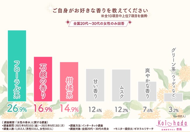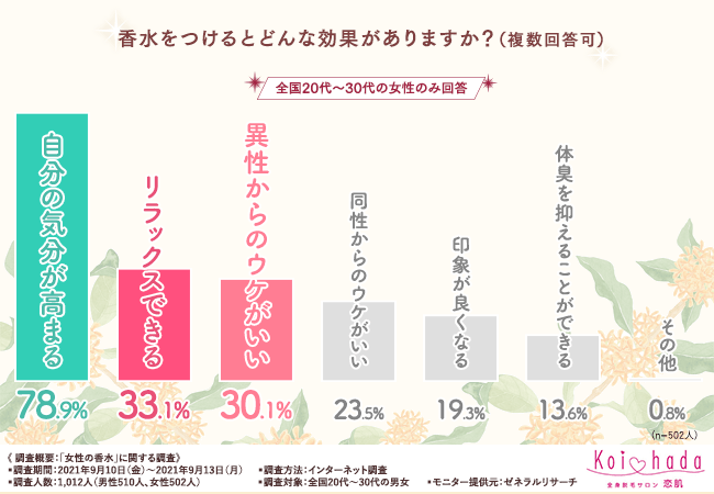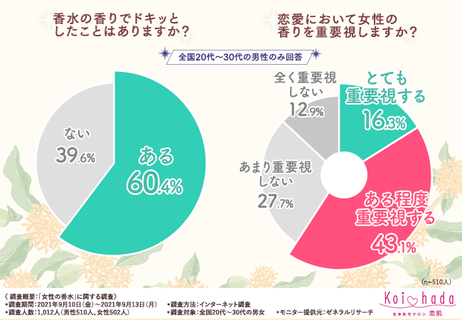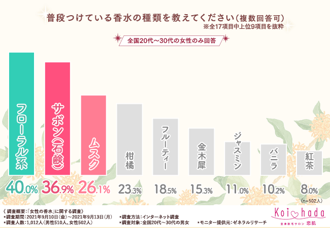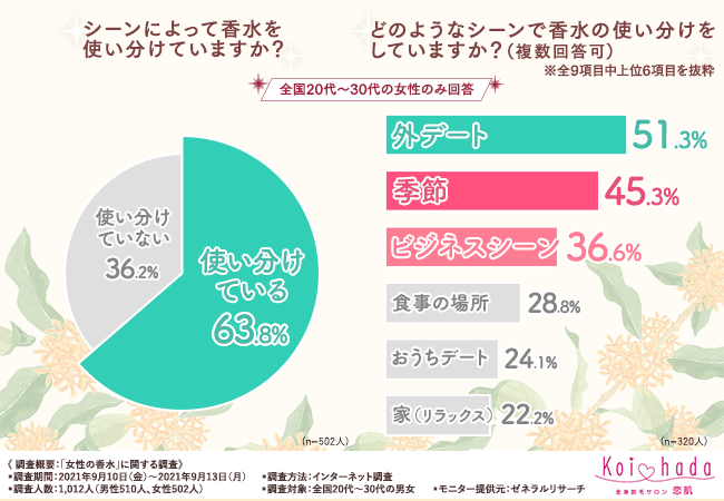 そこで今回、脱毛サロン『恋肌』(https://www.koi-hada.jp/)は、全国20代~30代の男女を対象に「女性の香水」に関する調査を実施しました。