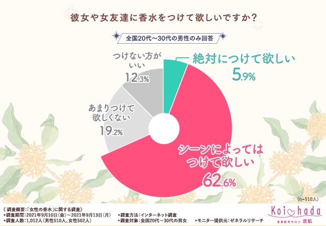 最後に、「彼女や女友達に香水をつけて欲しいですか?」と質問したところ、『絶対につけて欲しい(5.9%)』『シーンによってはつけて欲しい(62.6%)』と7割近くの男性は香水をつけて欲しいと考えていることがわかりました。
