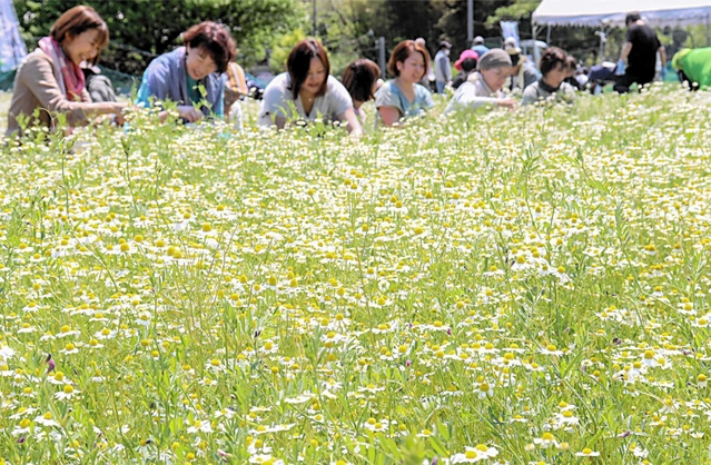 兵庫県姫路市夢前町山之内のカモミール畑で、収穫の体験会が開かれている。白色のかれんな花が初夏の風に揺られ、リンゴのような甘い香りが漂う中、連日、摘み取りを楽しむ家族連れらでにぎわっている。