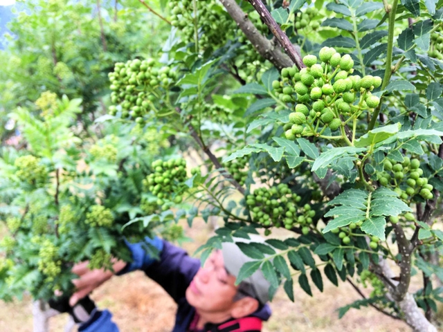 朝倉サンショウの収穫が、丹波地域でピークを迎えた。約130本を栽培する「奥丹波芦田農園」(兵庫県丹波市青垣町西芦田)でも、芦田美智則さん(70)らが手作業で摘み取り。「欧米への輸出に挑戦中」で、かんきつ類のような香りが鼻をくすぐる。(那谷享平)