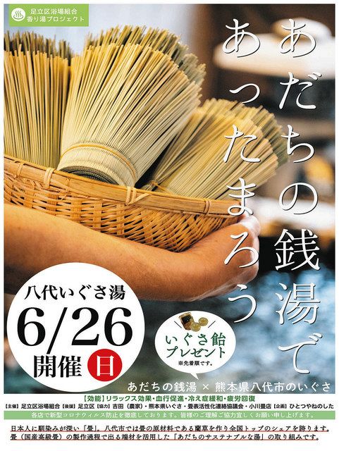 都公衆浴場業生活衛生同業組合足立支部が主催し、二年目。農業による地域活性化を図る区内の合同会社「ひとつやねのした」が企画する「香り湯プロジェクト」の一環で、国内最大のイグサ産地、熊本県八代市の生産者と連携し、同区の小川畳店(東和三)が端材を提供する。入浴客にイグサ粉末を練り込んだあめの配布もする。