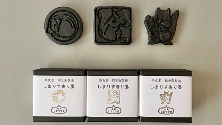 「奈良墨」は、約1,300年前から作られている伝統工芸品。今回の「しまりす香り墨」は、創業150年の歴史を持つ墨工房の「錦光園」によって製造されている。「錦光園」は、江戸時代からの代々の墨職人の家系で、由緒ある墨工房の「古梅園」の職長をしていた4代目・長野亀吉氏が明治時代に独立創業。「しまりす香り墨」は、「錦光園」の7代目の長野睦氏によると、クッキー型で作った初めての固形奈良墨であるという。