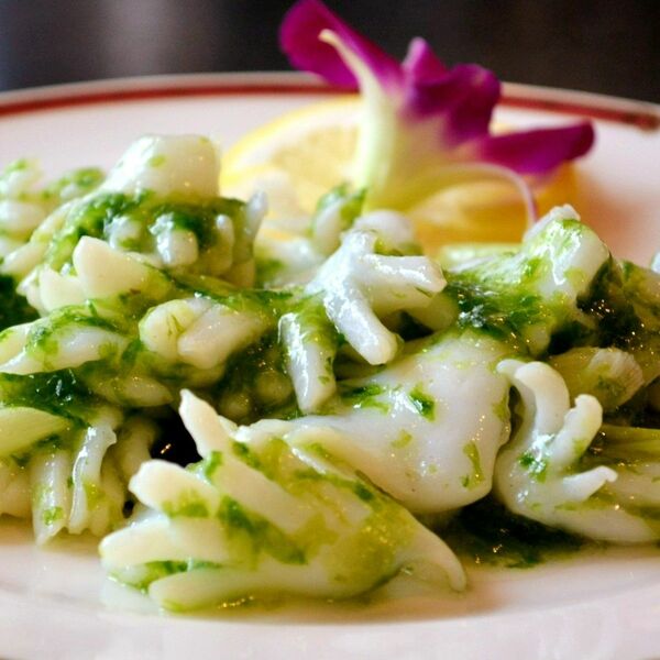 黒や茶色を基調にした落ち着いた雰囲気の店内。テーブルに運ばれてきたのは「イカと生のりの塩炒め」(1100円)。磯の香りがフワッと漂う。「夏なのでさっぱりしたものを」。オーナーシェフの前田賢司(まえだけんじ)さん(48)のお薦めだ。