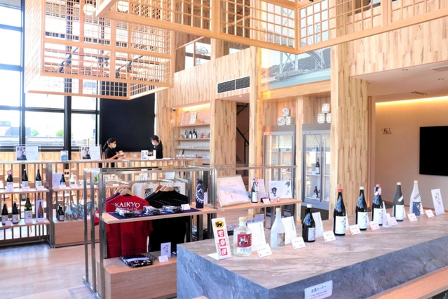 1階では同社製造の日本酒などを販売するほか、おちょこやグラス、手ぬぐいなどオリジナルグッズを豊富にそろえた。試飲もできるようになり、日本酒やジン、梅酒など計9種類を味わえる。2階は机や椅子を備えたセミナールームで、酒蔵や蒸留所の見学ツアー客らが利用する拠点となるという。