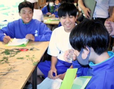 生徒は設楽町津具のヒノキの葉を切って蒸留装置に入れ、抽出された液体の香りを確かめた。清水廉さん(13)は「身近にある樹木から本物のエッセンシャルオイルが作れることを学んだ。景色を守るためのプロジェクトに興味を持った」と話した。